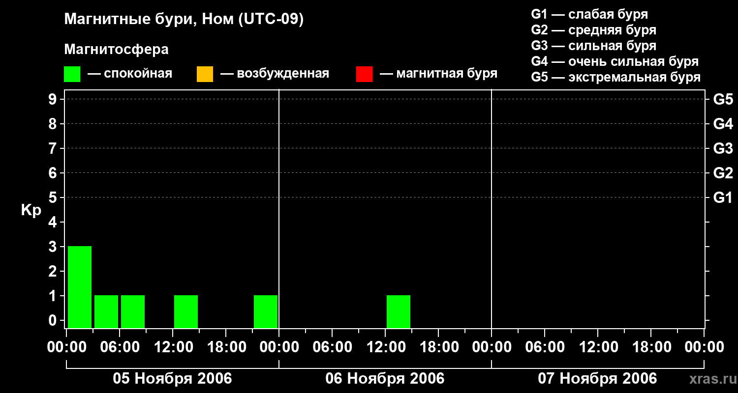 Изменения геомагнитного индекса Kp с 5 по 7 ноября 2006 года для средних широт