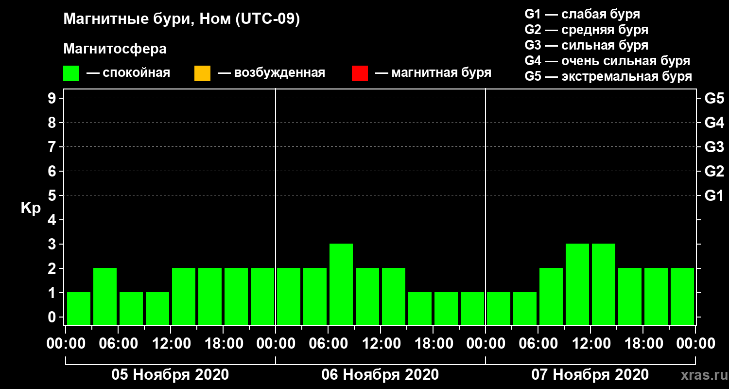 Изменения геомагнитного индекса Kp с 5 по 7 ноября 2020 года для средних широт