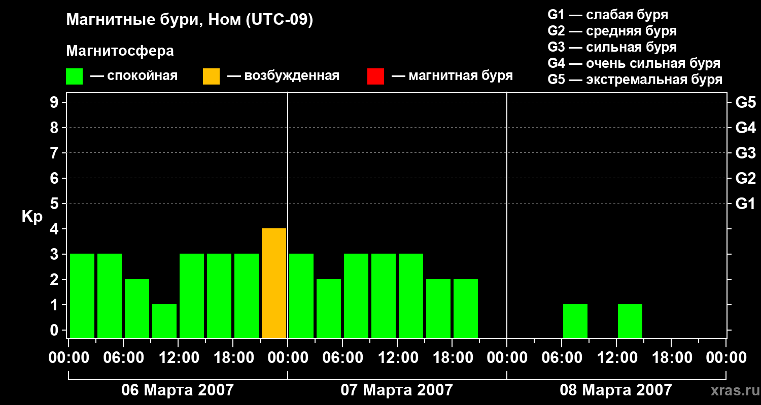 Изменения геомагнитного индекса Kp с 6 по 8 марта 2007 года для средних широт