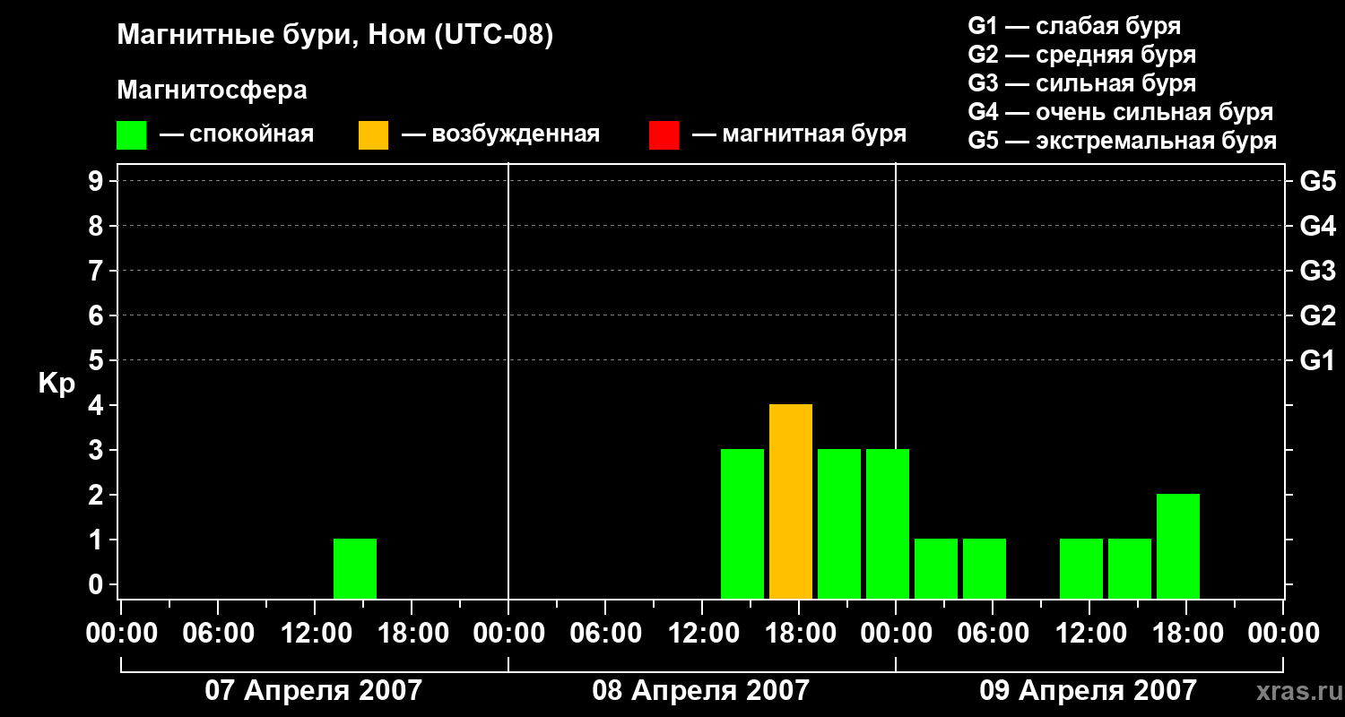 Изменения геомагнитного индекса Kp с 7 по 9 апреля 2007 года для средних широт