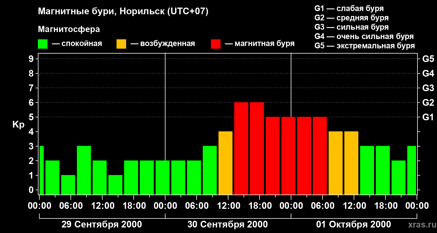 Изменения геомагнитного индекса Kp с 29 сентября по 1 октября 2000 года для средних широт