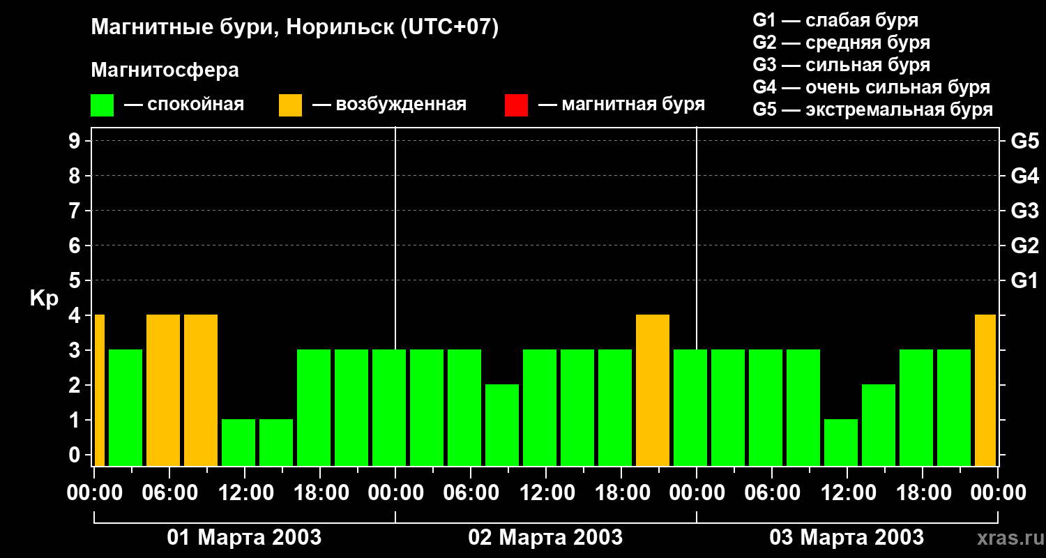 Изменения геомагнитного индекса Kp с 1 по 3 марта 2003 года для средних широт