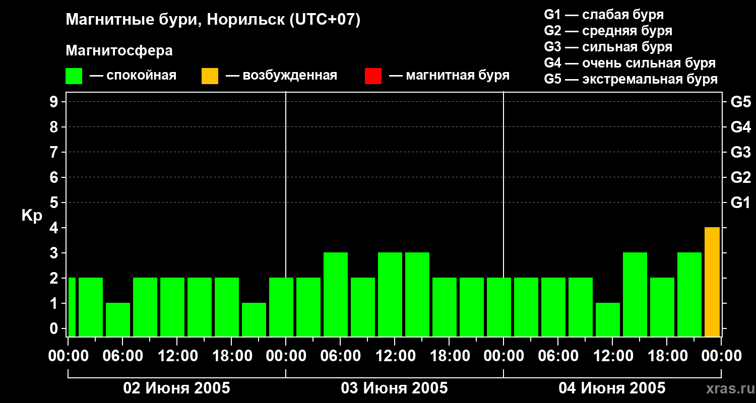 Изменения геомагнитного индекса Kp с 2 по 4 июня 2005 года для средних широт