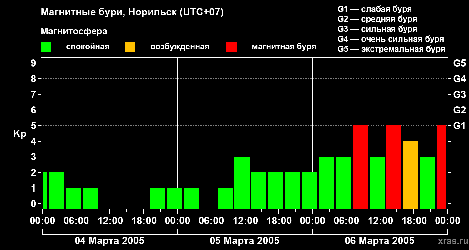 Изменения геомагнитного индекса Kp с 4 по 6 марта 2005 года для средних широт