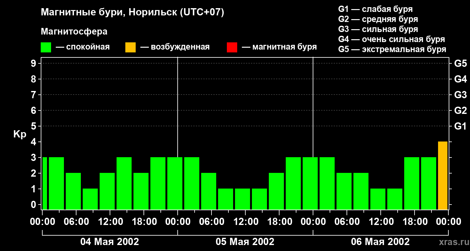 Изменения геомагнитного индекса Kp с 4 по 6 мая 2002 года для средних широт