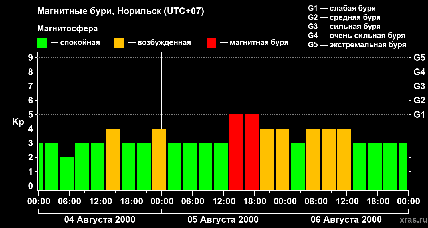 Изменения геомагнитного индекса Kp с 4 по 6 августа 2000 года для средних широт