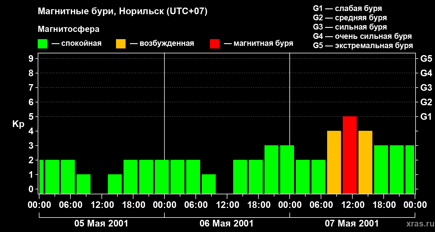 Изменения геомагнитного индекса Kp с 5 по 7 мая 2001 года для средних широт