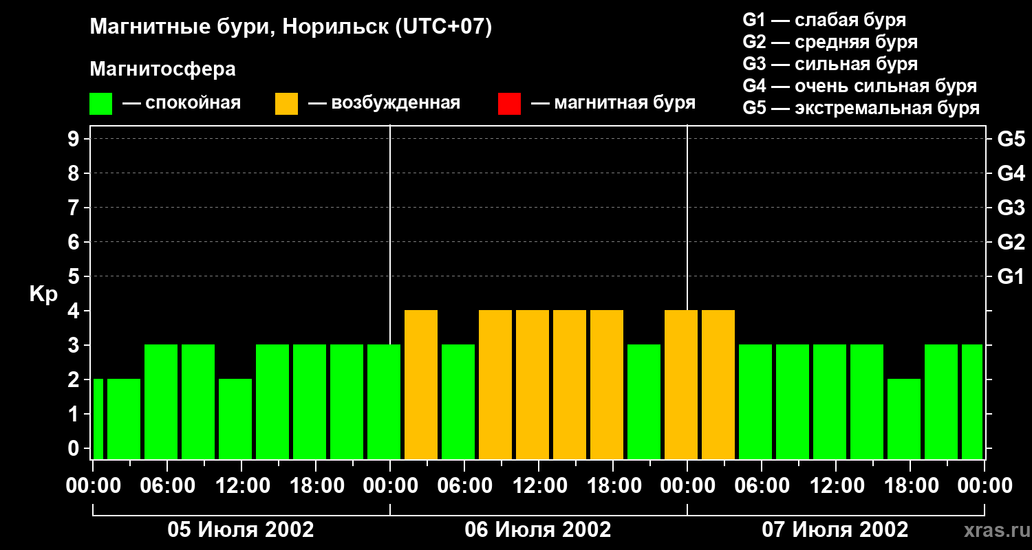 Изменения геомагнитного индекса Kp с 5 по 7 июля 2002 года для средних широт