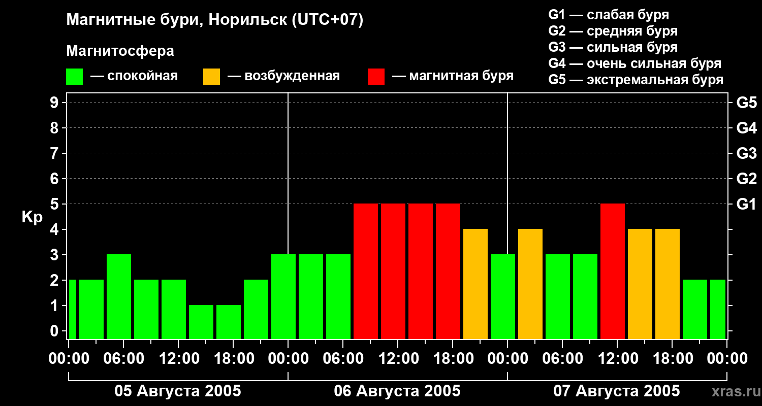 Изменения геомагнитного индекса Kp с 5 по 7 августа 2005 года для средних широт