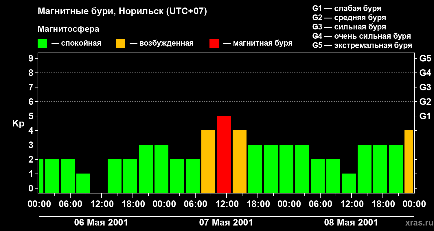 Изменения геомагнитного индекса Kp с 6 по 8 мая 2001 года для средних широт