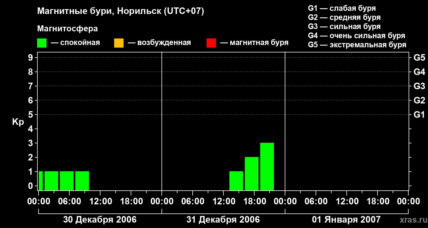 Изменения геомагнитного индекса Kp с 30 декабря 2006 года по 1 января 2007 года для средних широт
