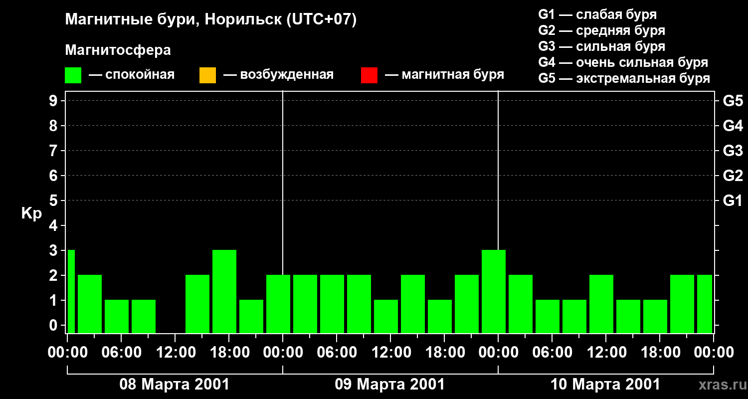 Изменения геомагнитного индекса Kp с 8 по 10 марта 2001 года для средних широт