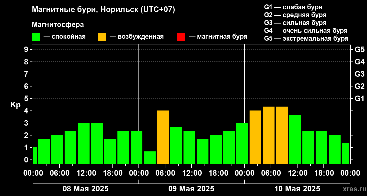 Изменения геомагнитного индекса Kp с 8 по 10 мая 2025 года для средних широт