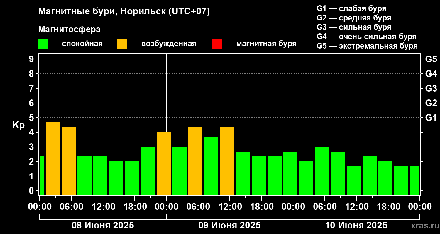 Изменения геомагнитного индекса Kp с 8 по 10 июня 2025 года для средних широт