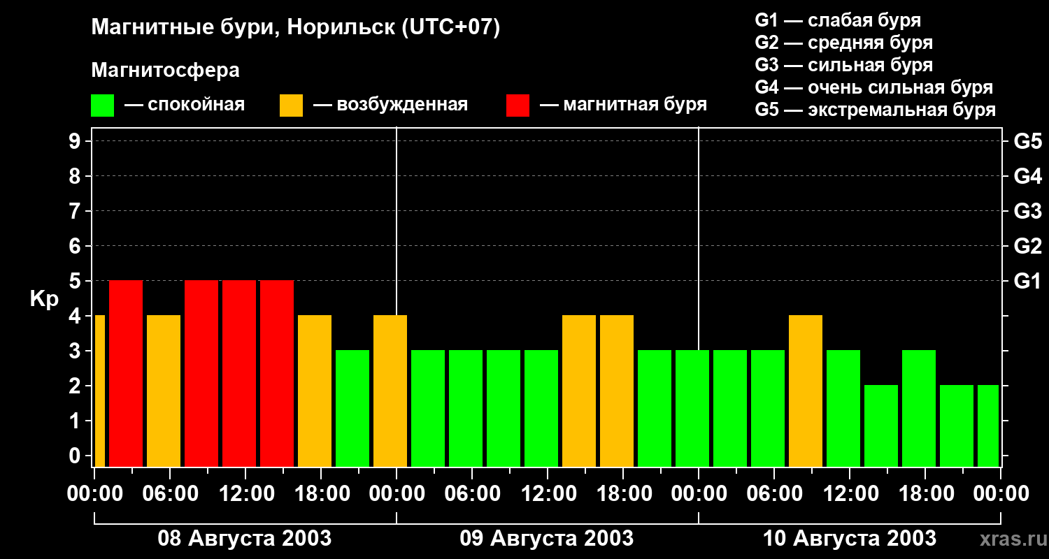 Изменения геомагнитного индекса Kp с 8 по 10 августа 2003 года для средних широт