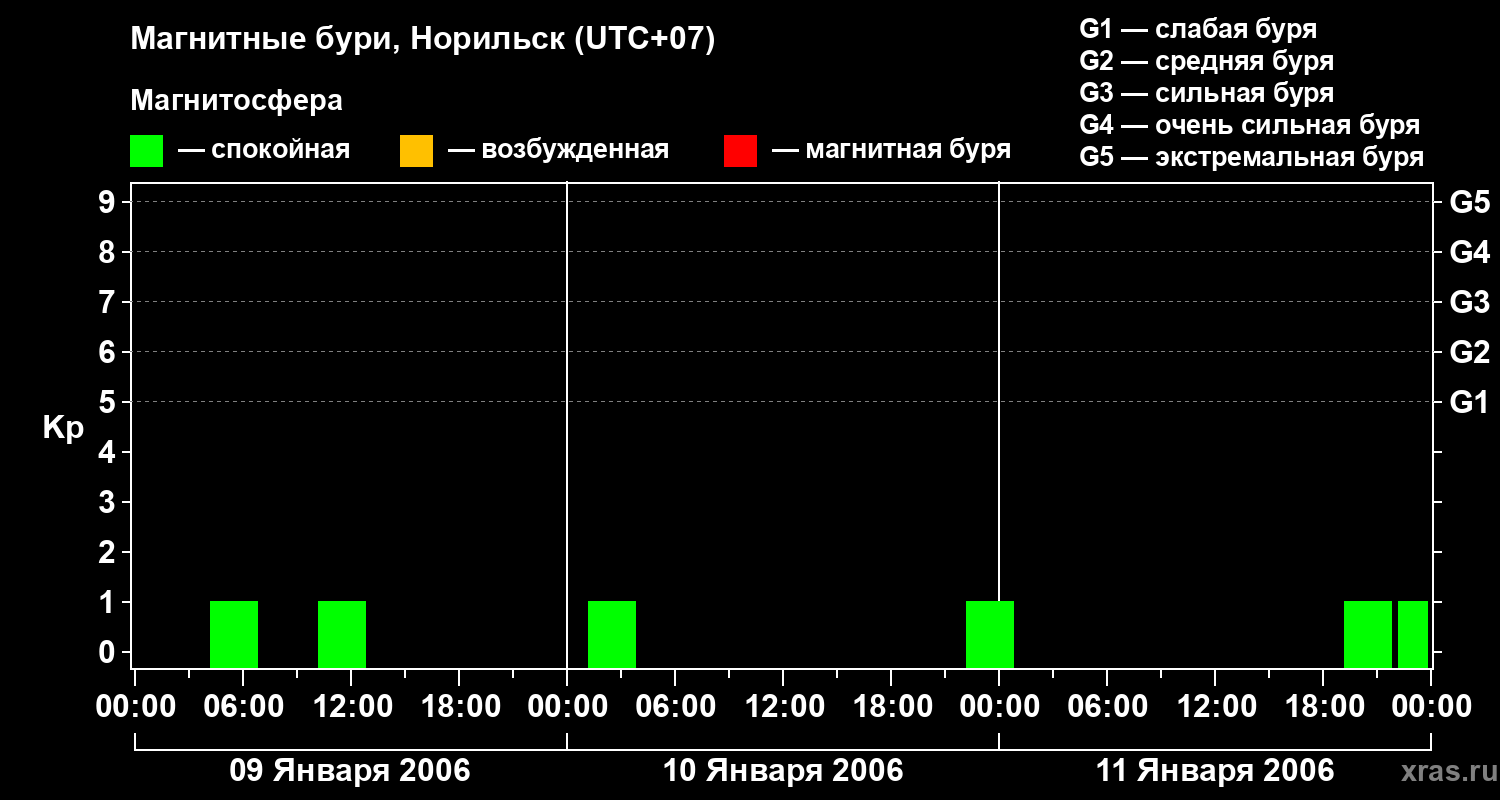 Изменения геомагнитного индекса Kp с 9 по 11 января 2006 года для средних широт