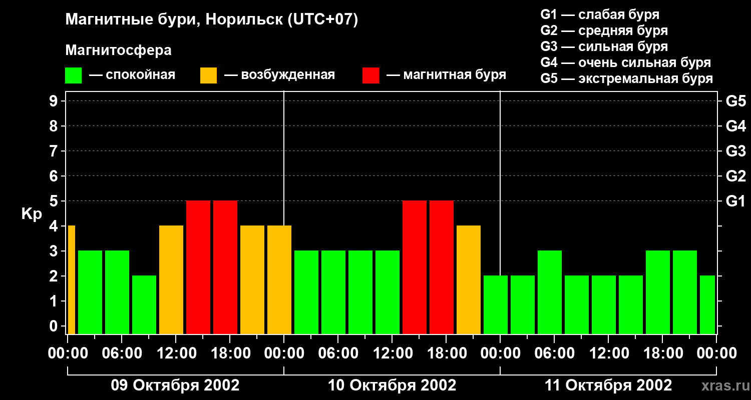 Изменения геомагнитного индекса Kp с 9 по 11 октября 2002 года для средних широт