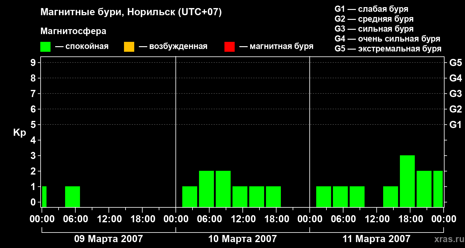 Изменения геомагнитного индекса Kp с 9 по 11 марта 2007 года для средних широт