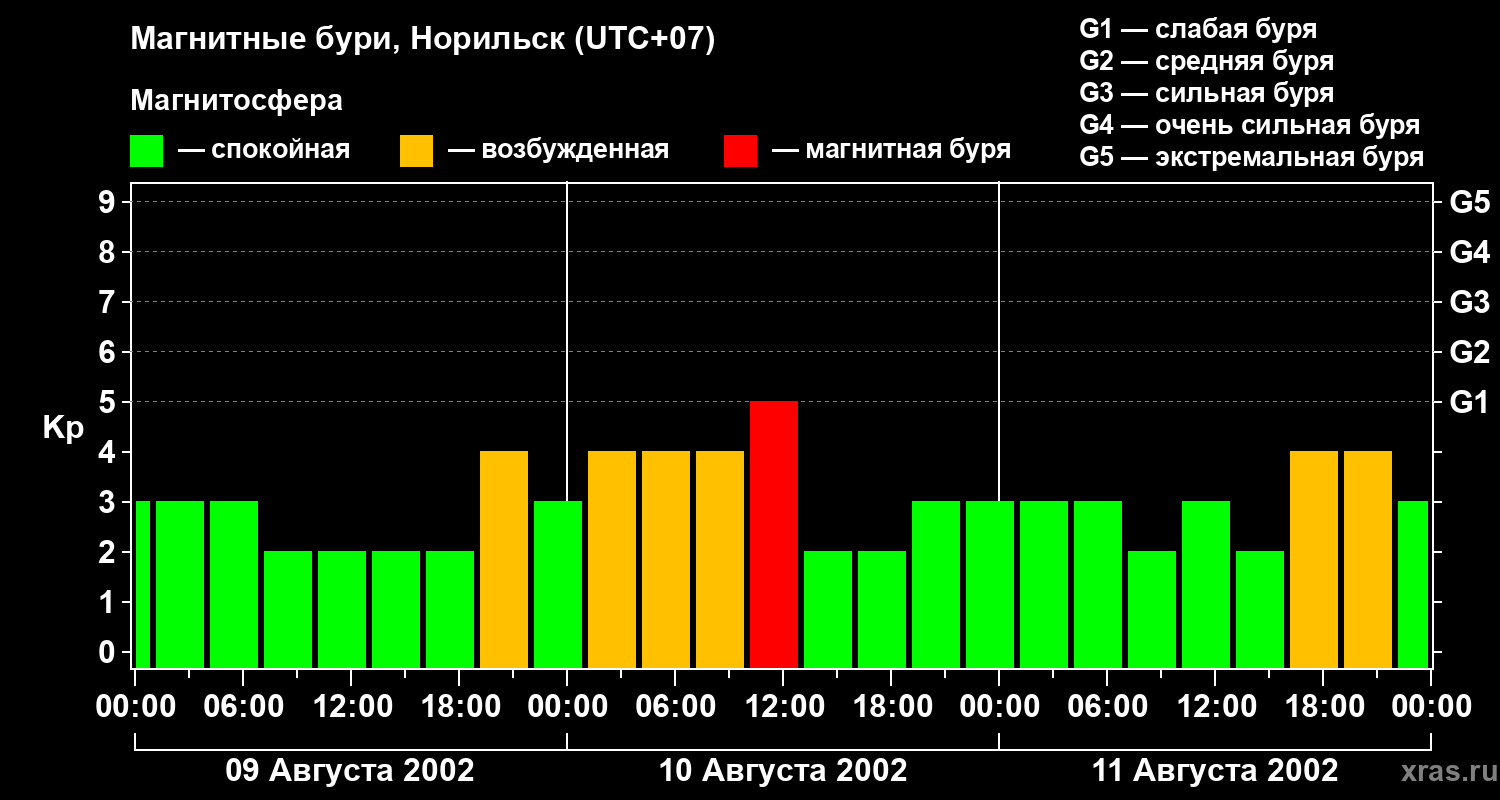 Изменения геомагнитного индекса Kp с 9 по 11 августа 2002 года для средних широт