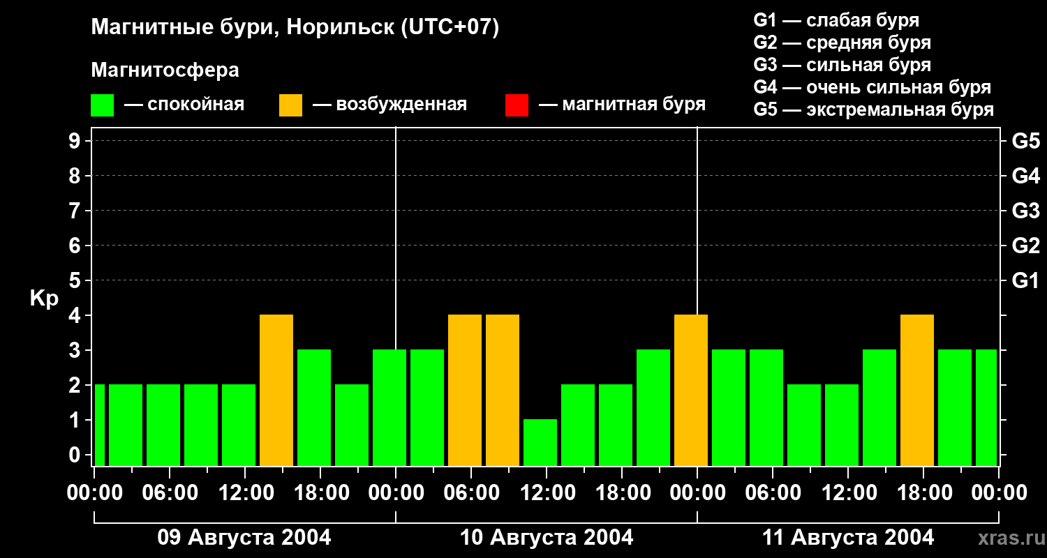 Изменения геомагнитного индекса Kp с 9 по 11 августа 2004 года для средних широт