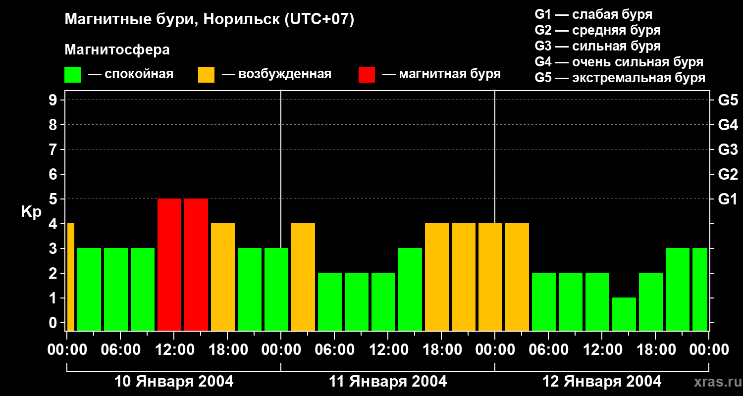 Изменения геомагнитного индекса Kp с 10 по 12 января 2004 года для средних широт