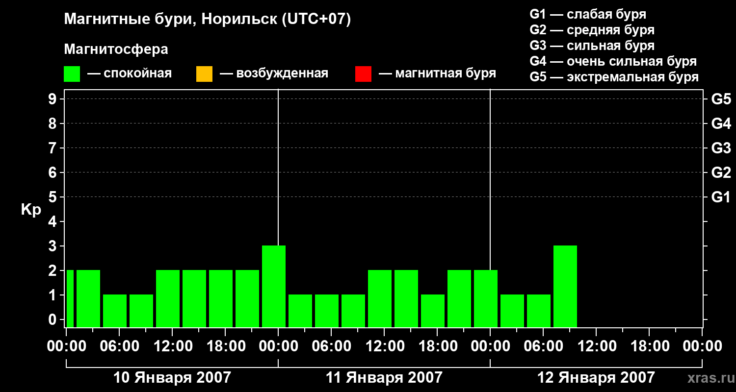 Изменения геомагнитного индекса Kp с 10 по 12 января 2007 года для средних широт
