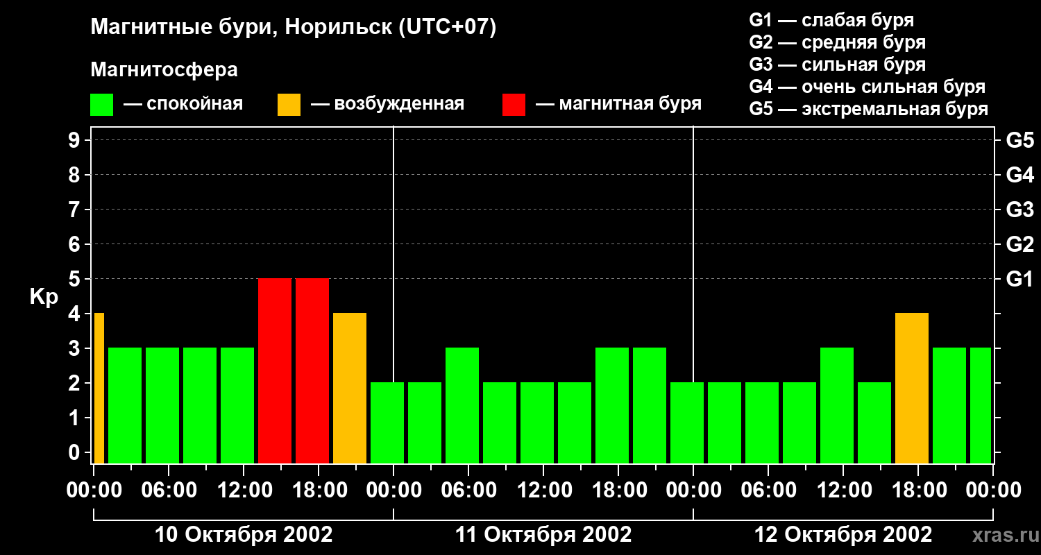 Изменения геомагнитного индекса Kp с 10 по 12 октября 2002 года для средних широт