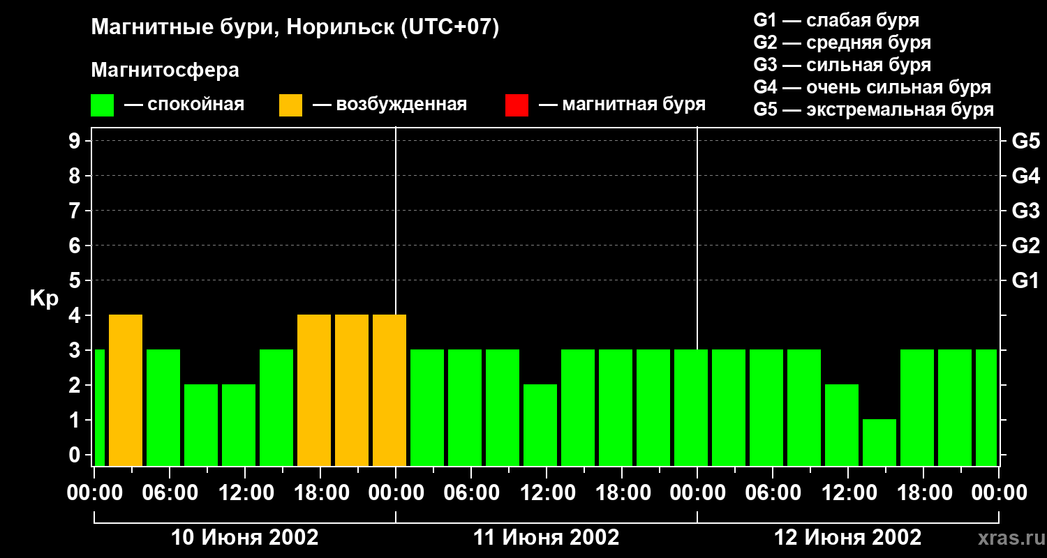 Изменения геомагнитного индекса Kp с 10 по 12 июня 2002 года для средних широт