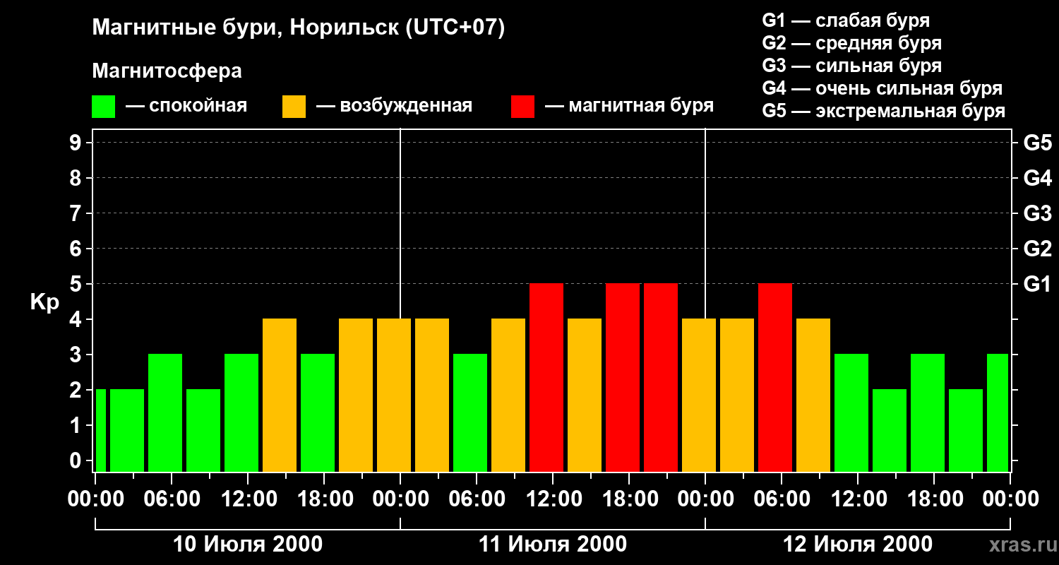 Изменения геомагнитного индекса Kp с 10 по 12 июля 2000 года для средних широт