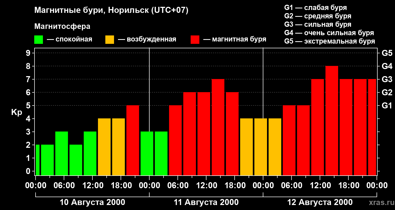 Изменения геомагнитного индекса Kp с 10 по 12 августа 2000 года для средних широт