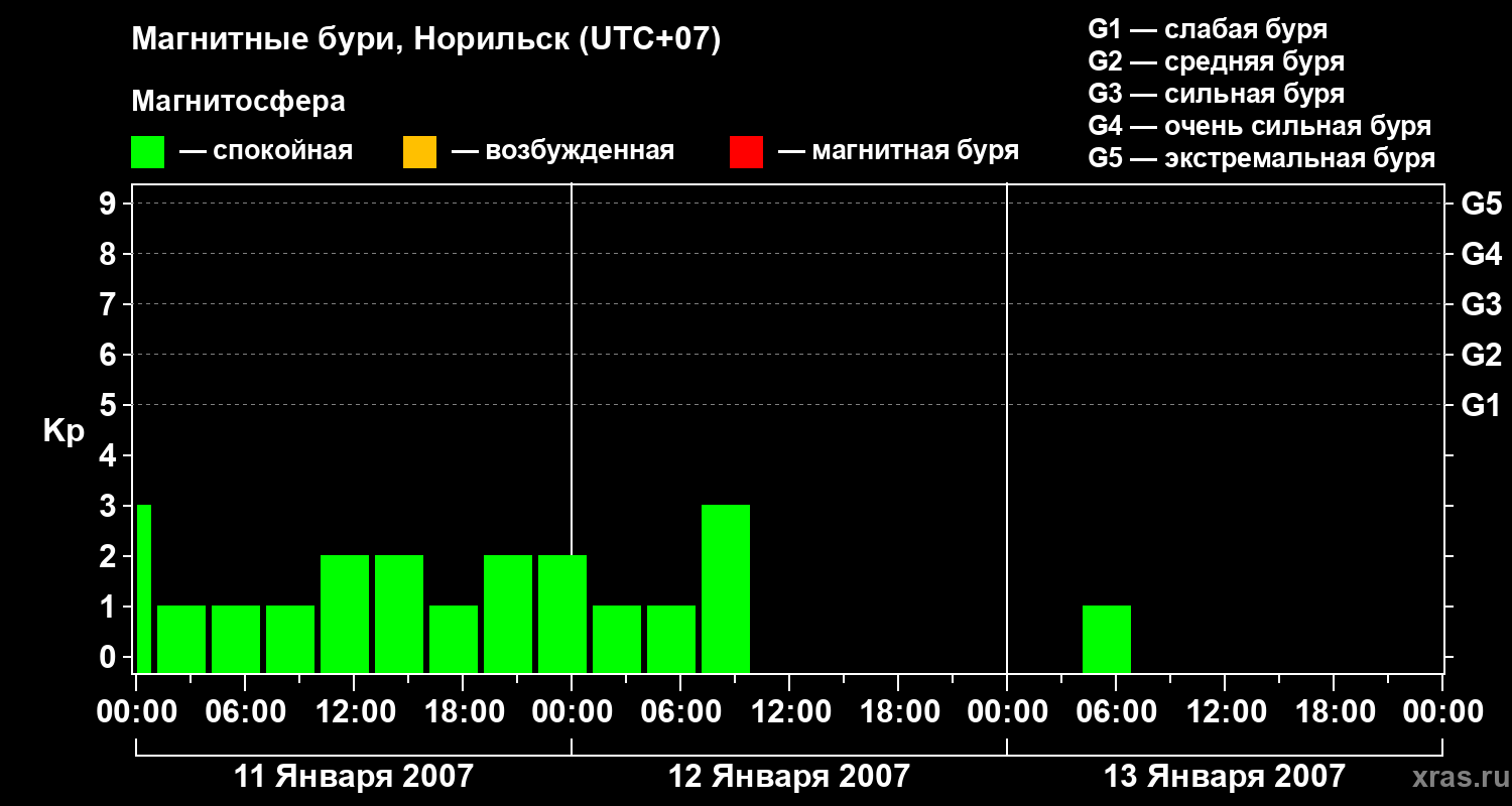 Изменения геомагнитного индекса Kp с 11 по 13 января 2007 года для средних широт