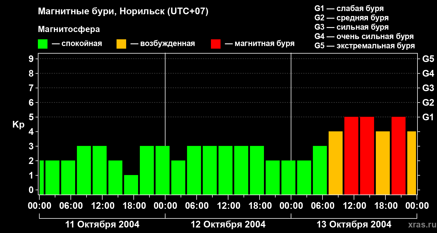 Изменения геомагнитного индекса Kp с 11 по 13 октября 2004 года для средних широт