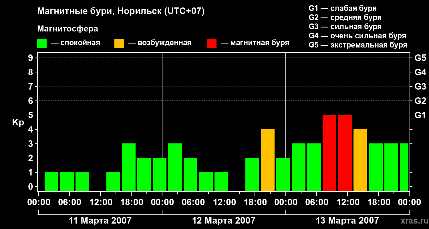 Изменения геомагнитного индекса Kp с 11 по 13 марта 2007 года для средних широт