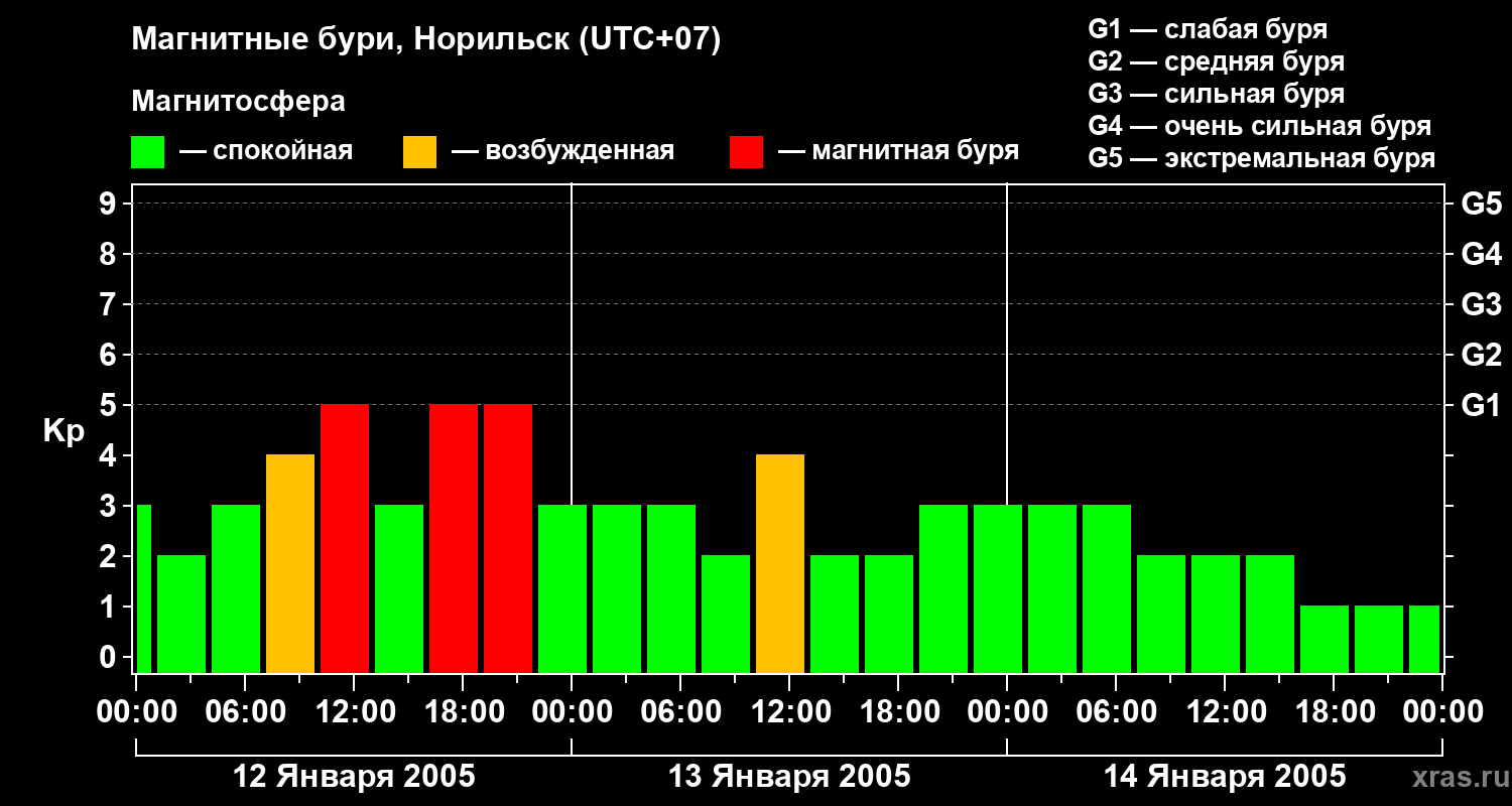 Изменения геомагнитного индекса Kp с 12 по 14 января 2005 года для средних широт