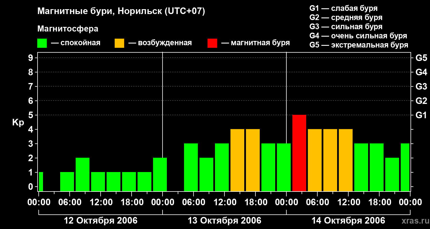 Изменения геомагнитного индекса Kp с 12 по 14 октября 2006 года для средних широт