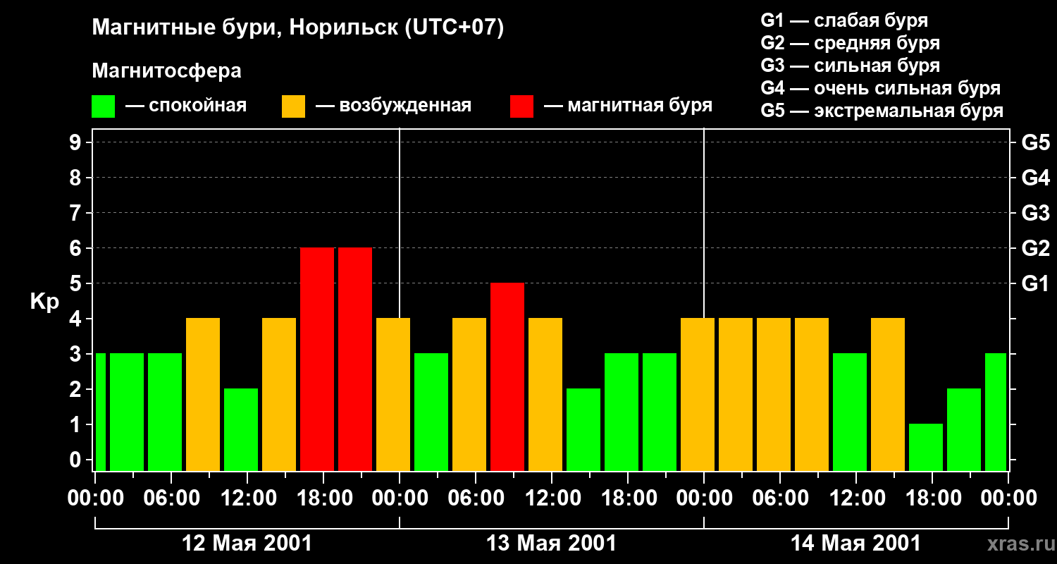 Изменения геомагнитного индекса Kp с 12 по 14 мая 2001 года для средних широт