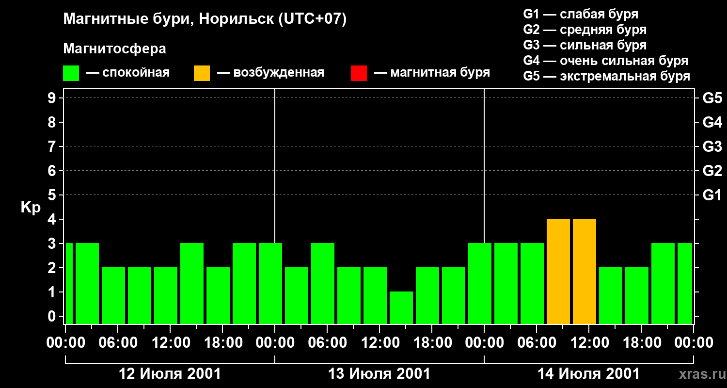 Изменения геомагнитного индекса Kp с 12 по 14 июля 2001 года для средних широт