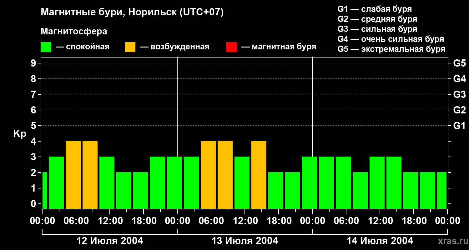 Изменения геомагнитного индекса Kp с 12 по 14 июля 2004 года для средних широт