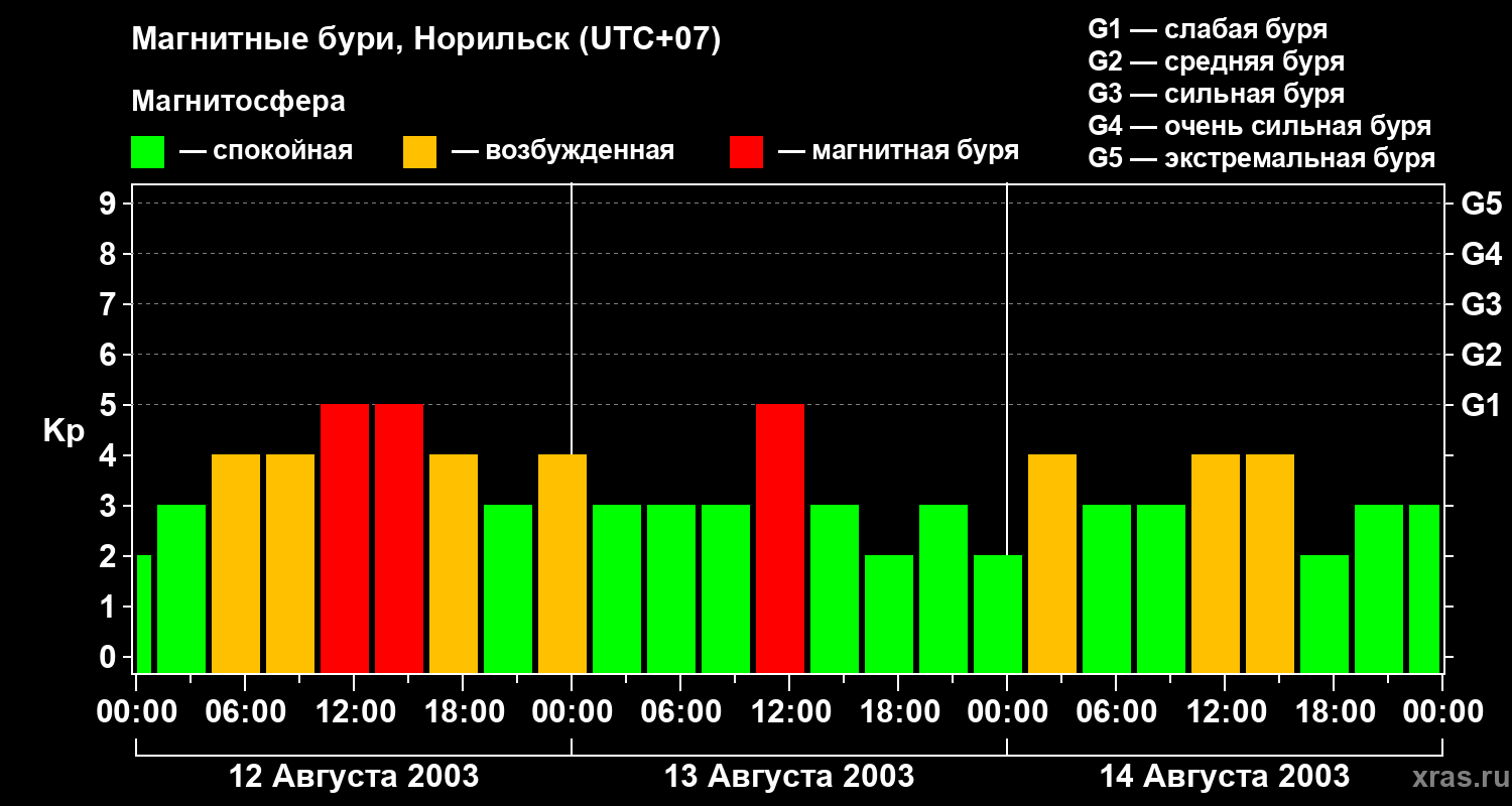 Изменения геомагнитного индекса Kp с 12 по 14 августа 2003 года для средних широт
