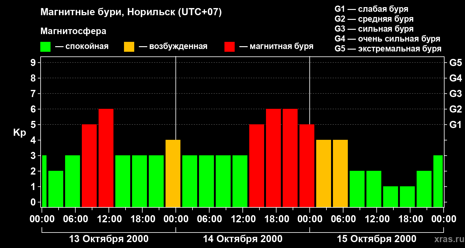 Изменения геомагнитного индекса Kp с 13 по 15 октября 2000 года для средних широт