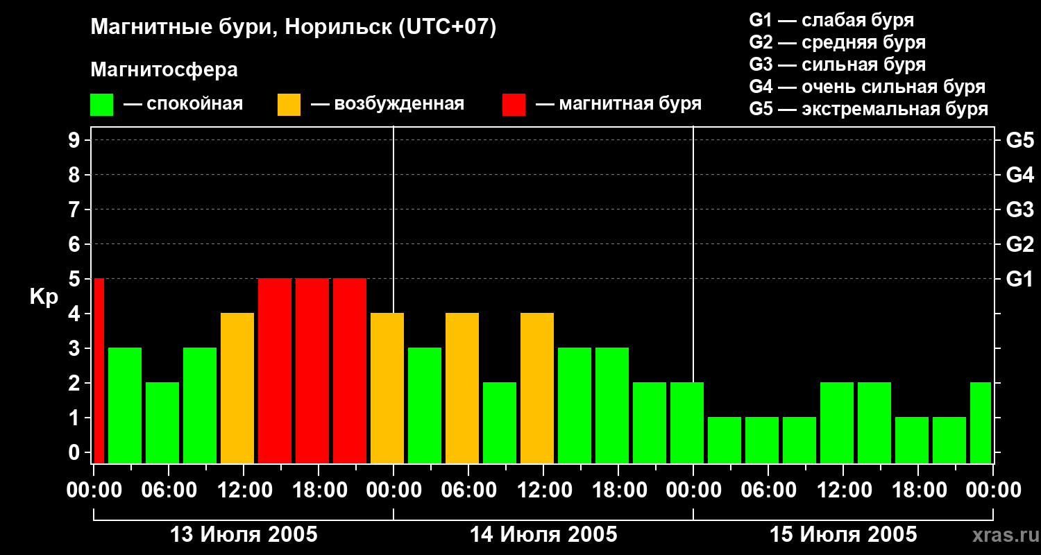 Изменения геомагнитного индекса Kp с 13 по 15 июля 2005 года для средних широт