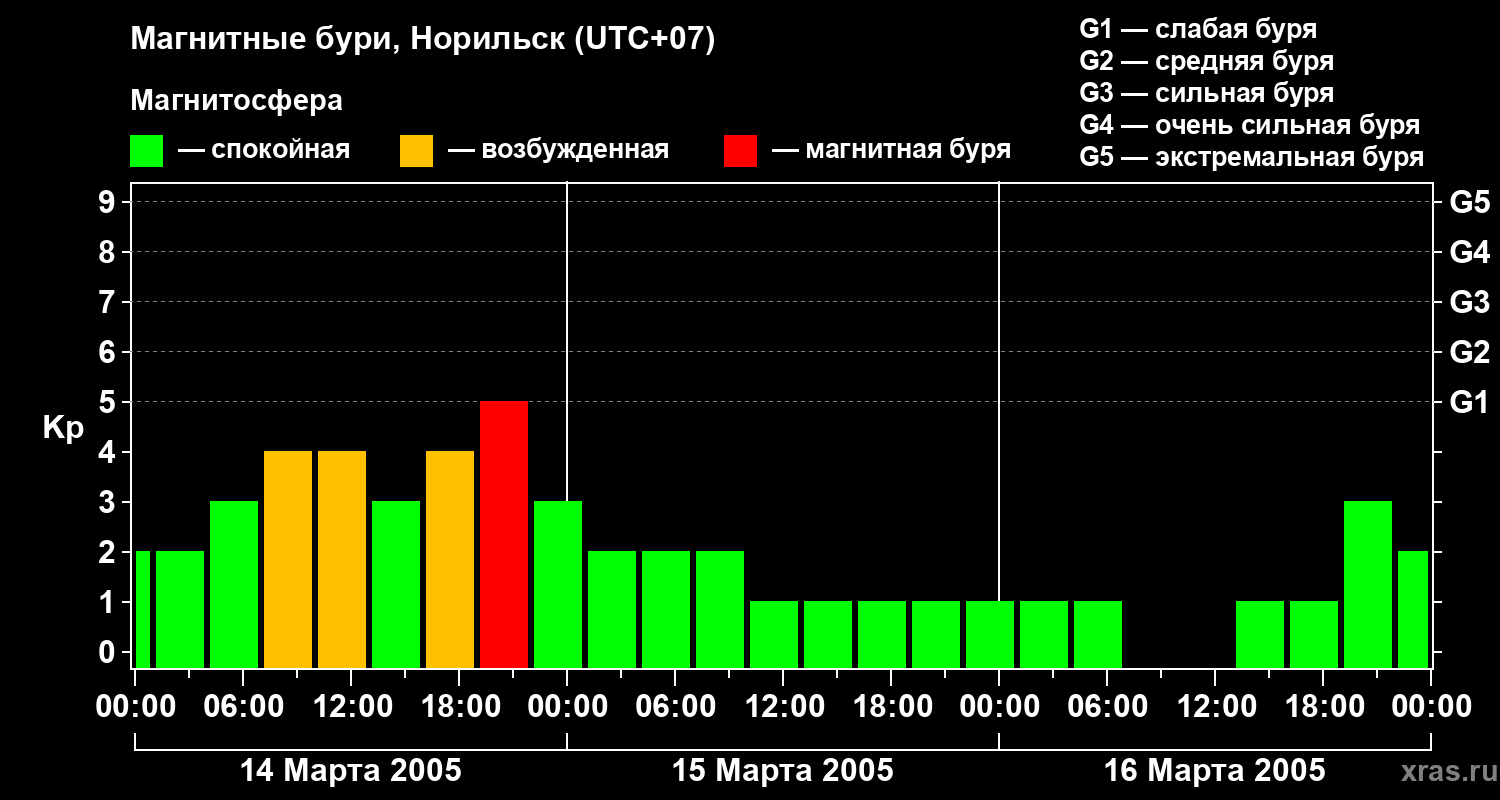 Изменения геомагнитного индекса Kp с 14 по 16 марта 2005 года для средних широт
