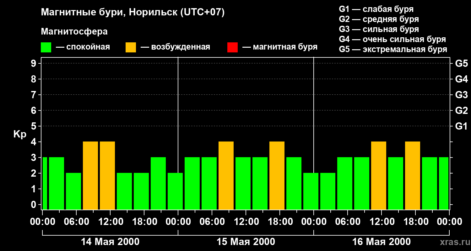Изменения геомагнитного индекса Kp с 14 по 16 мая 2000 года для средних широт