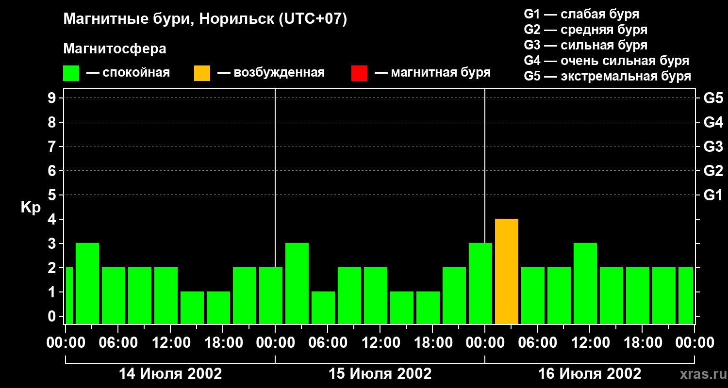 Изменения геомагнитного индекса Kp с 14 по 16 июля 2002 года для средних широт