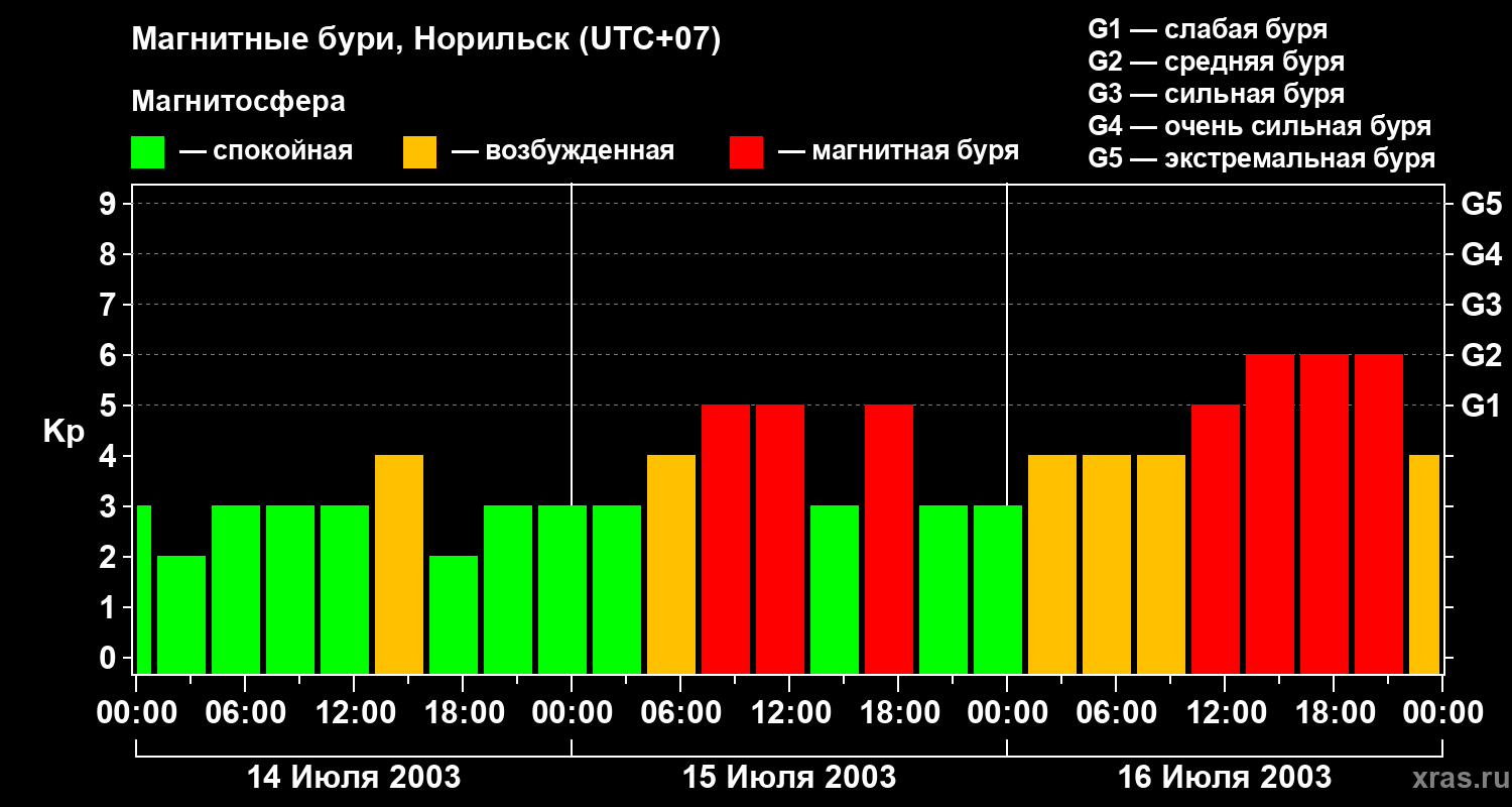 Изменения геомагнитного индекса Kp с 14 по 16 июля 2003 года для средних широт