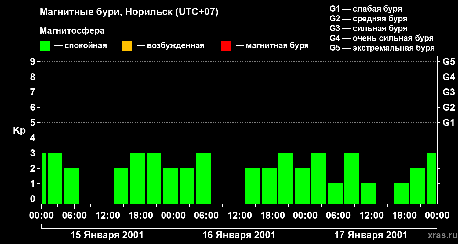 Изменения геомагнитного индекса Kp с 15 по 17 января 2001 года для средних широт