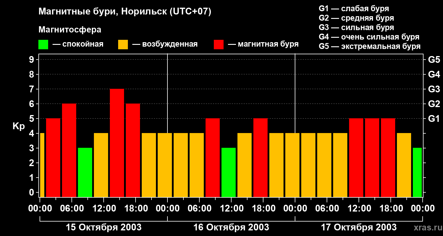 Изменения геомагнитного индекса Kp с 15 по 17 октября 2003 года для средних широт