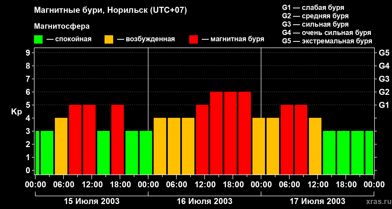 Изменения геомагнитного индекса Kp с 15 по 17 июля 2003 года для средних широт