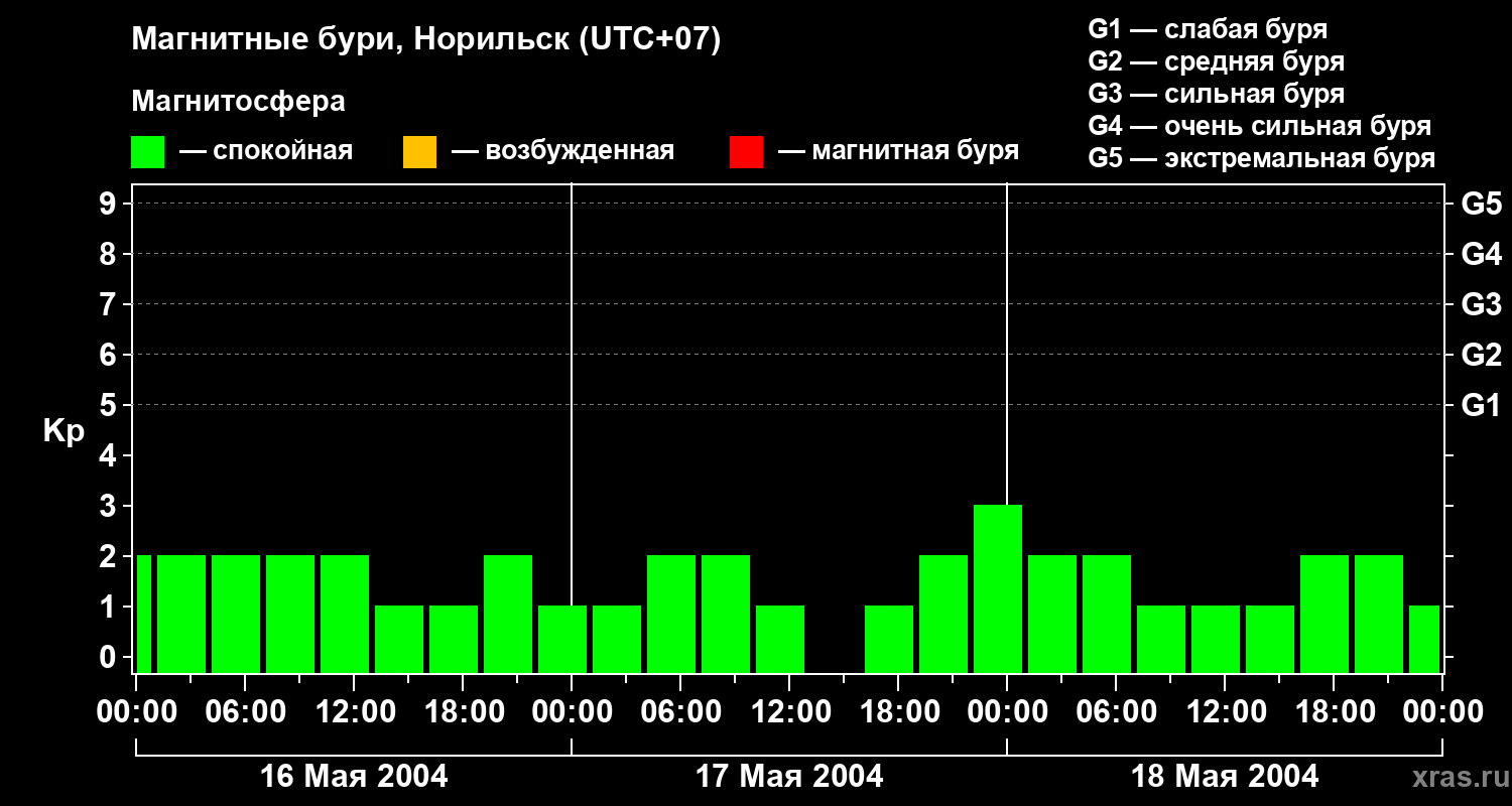 Изменения геомагнитного индекса Kp с 16 по 18 мая 2004 года для средних широт