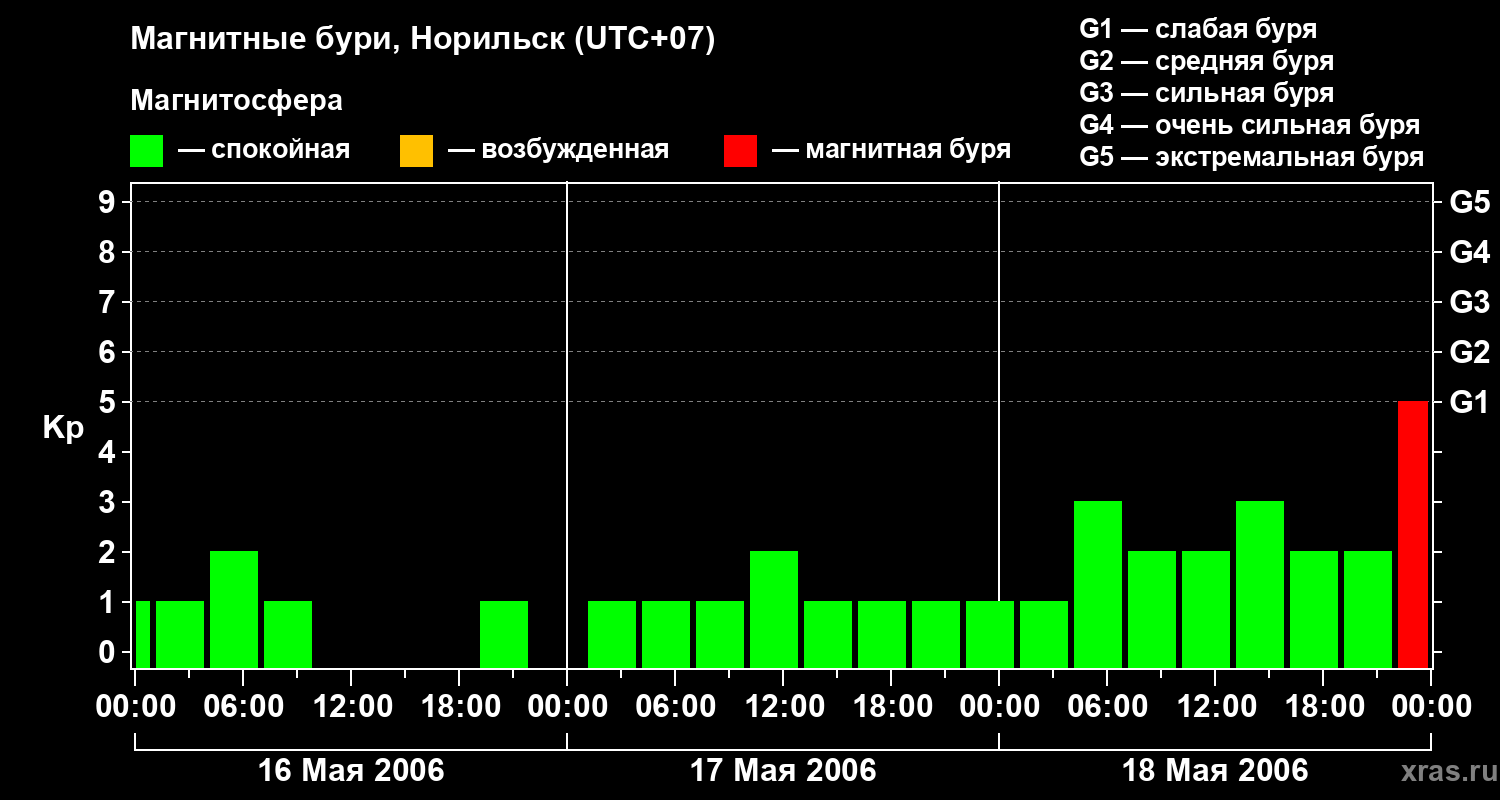 Изменения геомагнитного индекса Kp с 16 по 18 мая 2006 года для средних широт